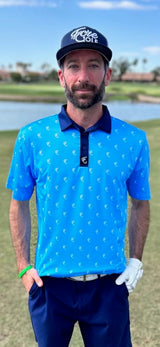 The FG Signature Polo in Carolina Sky Blue will make sure you have the best round, maybe not score, but for sure dressed. Who does not like a high quality polo in one of the most iconic colors available! The FG pattern is sublimated into the design and on the button placket we have the FG symbol in a woven label.