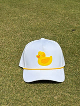 The Ducky Hat is a perfect addition to your golf headwear. A 5-panel rope hat, laser cut holes in the back panels, snap back and the Ducky logo on front is a rubber/PVC patch. The material is also water resistant, so you are not water logged if caught in that rainstorm while trying to finish the round.